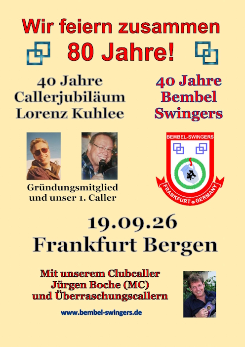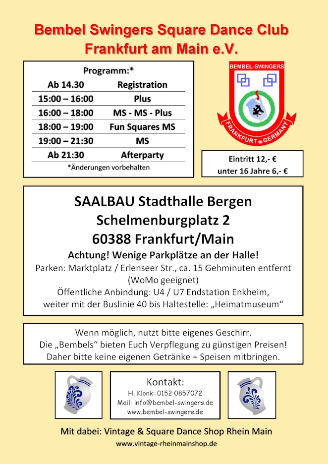 Liveauftritt die Vielfalt des Square Dance und hoffen mit dem Spass, den die Tänzer dabei haben, die Zuschauer anzustecken um es vielleicht einmal selbst zu versuchen. Wenn auch Ihr Interesse daran habt, dass die Bembel Swingers mit einer Square Dance Demo bei Eurer Veranstaltung auftreten, dann setzt Euch bitte mit unserem Travel Coordinator in Verbindung.